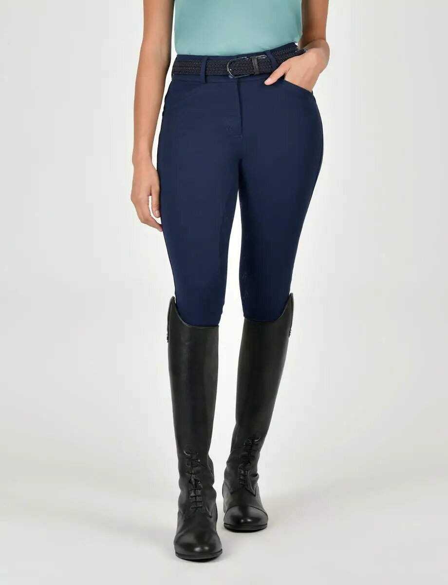 Fitted classic style breeches in a 4-way stretch twill fabric and high stretch knit panel at lower leg, for comfort and fit
