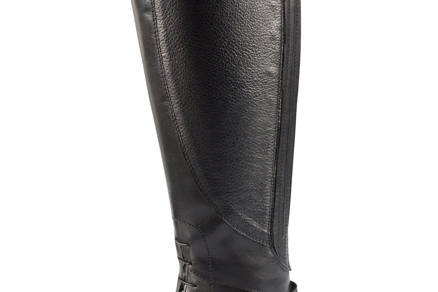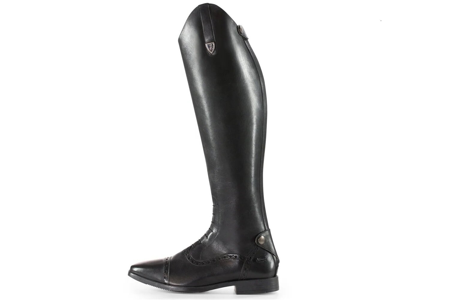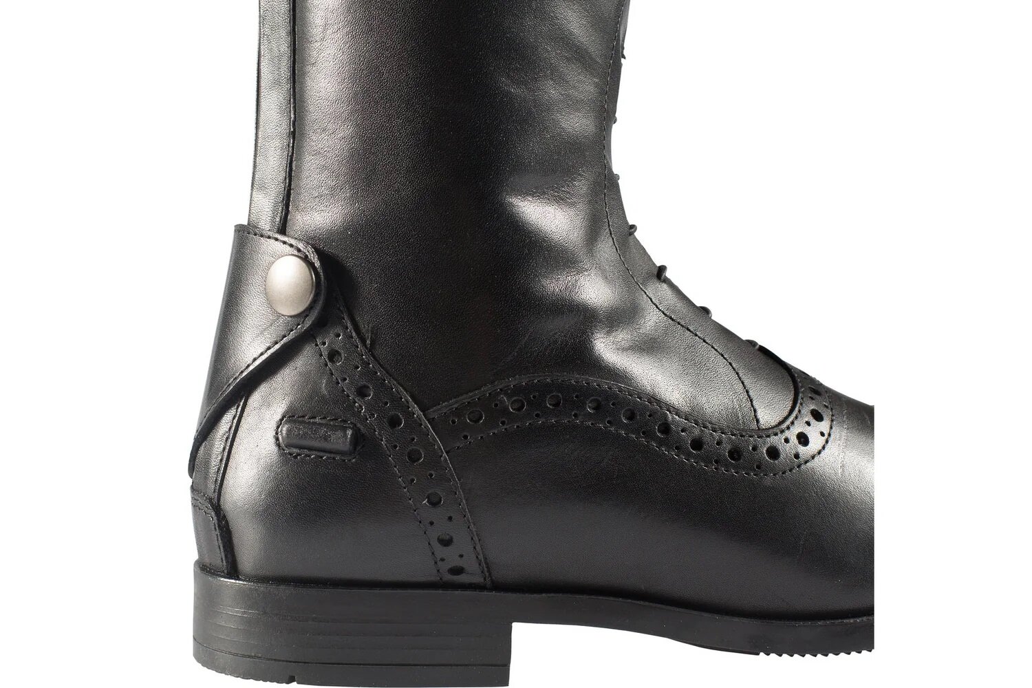 The foot is finished with elegant punched detailing, fixed elastic laces, and a well-placed spur rest. Inside, a soft suede lining enhances comfort throughout the day. At the top of the leg shaft, a distinctive Z emblem is accented with a small metal button set with a crystal-encrusted logo. Leather straps with snap buttons at both the top and bottom of the zipper keep the boot securely fastened.
