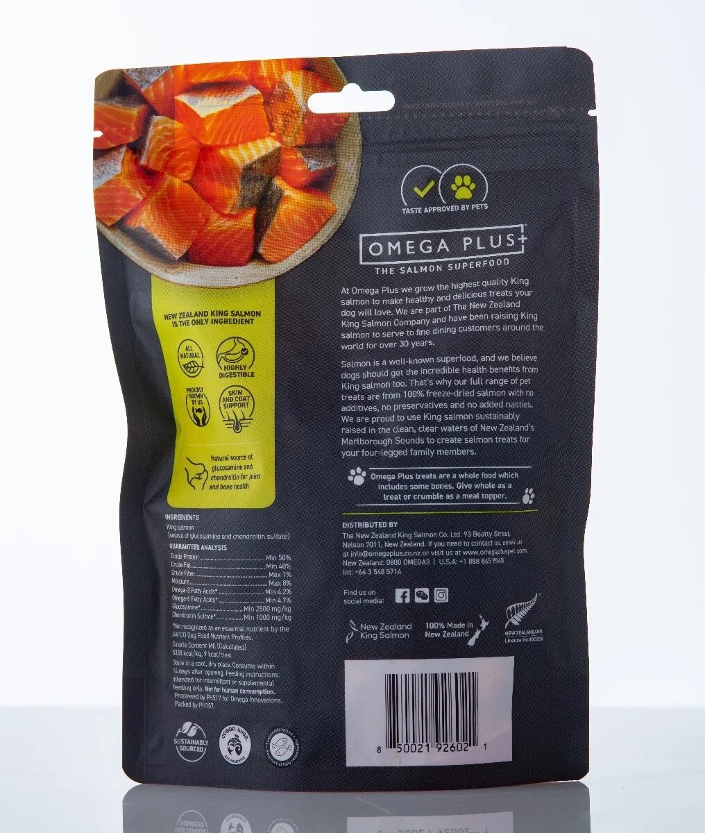 Omega Plus Pet King Salmon Bites are 100% New Zealand King salmon and are all natural.
