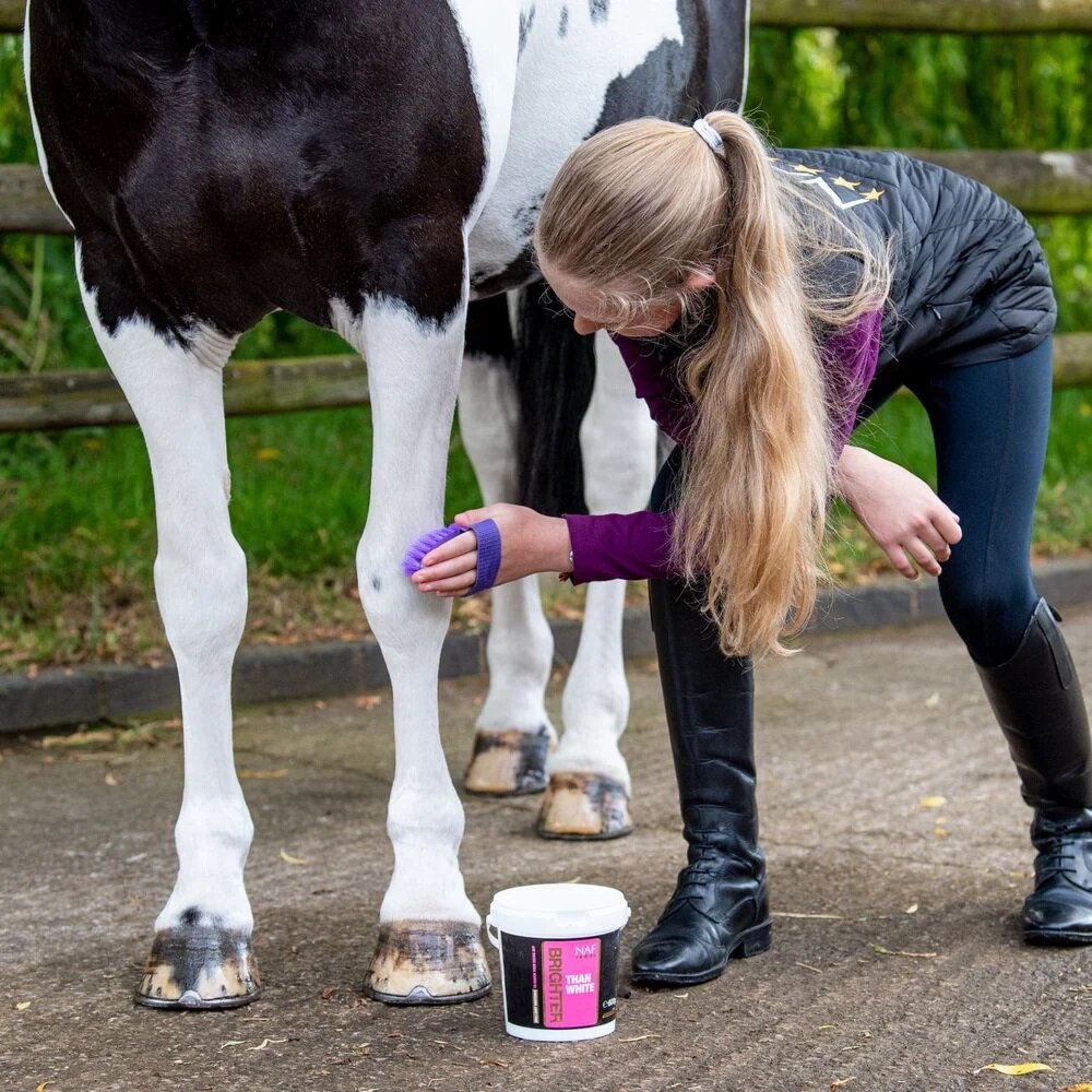 Brighter than White can be applied as a powder directly onto the area, or as a paste when you simply mix with water.  Leave on and then brush off when dry, the area will be left looking Brighter than White.