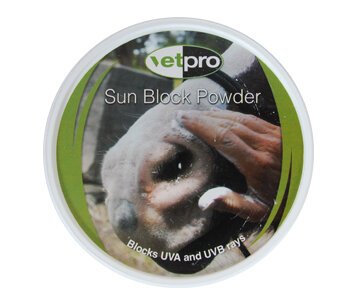 Unique powder formula that blocks all UVA and UVB rays.An innovative solution to protecting the white skin of animals that is susceptible to sun damage.Sunblock Powder creates a smooth film like coating when applied to the skin – similar to a human cosmetic powder. Since it is a light powder pets do not have an adverse reaction to application on sensitive areas like around the muzzle. The sponge fits neatly into the hand so your pet is unaware of any sensation other than the light touch of a hand, therefore does not try and rub it off on surrounding surfaces and people.Blocks all UVA and UVB rays Is easy to apply with a small dabbing sponge (provided) Has an all natural non-irritant formula Is economic as a small amount covers a large area Long lasting 24 hours minimum (unless washed off) Is non-sticky so does not attract dust and feed Available in a 120gm pot complete with applicator sponge Economic – small amount covers large area Long lasting 24 hours minimum Easy to apply with a small sponge applicator (provided) All natural non-irritant formula that creates a smooth coating (like human cosmetic powder finish) Total protection Non sticky – does not attract dirt or dust Avoids the adverse pet reaction to application of cream sunscreens and the desire to rub off